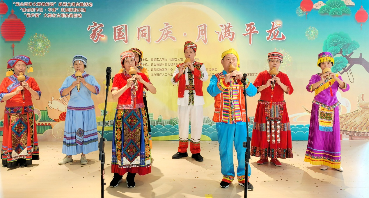 揭牌仪式后,第一场“花声麦”大舞台文明实践活动随即精彩上演。老干曲艺社带来的粤语版歌舞《我和我的祖国》,以深情的演唱和优美的伴舞,将心中对祖国最深沉的爱化作动人旋律,引发了全场共鸣。葫芦丝合奏一曲《映山红》深情款款,《阿瓦人民唱新歌》欢快活泼,轻柔细腻的乐声带领观众领略别样的民族风情。客家山歌《八月十五月光光》,用原汁原味的乡音唱出游子的思乡情,展现了花山深厚的客家文化底蕴。粤曲小调《彩云追月》,悠扬的粤韵充满了诗情画意;云儿朵朵的舞者们以舞蹈《春意浓》,展现了春的盎然与生命的律动,表达了对美好生活的向往。配乐诗朗诵《中秋之夜》,则用声音描绘了一个宁静温馨、充满思念的月夜图景。